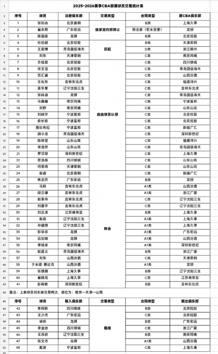 据CBA官方统计,2023-2024赛季各俱乐部共完成国内球员交易46人次,其中转会13人次;2024-2025赛季各俱乐部共完成国内球员交易42人次,其中转会10人次;来到2025-2026赛季,各俱乐部共完成国内球员交易48人次,其中转会18人次。